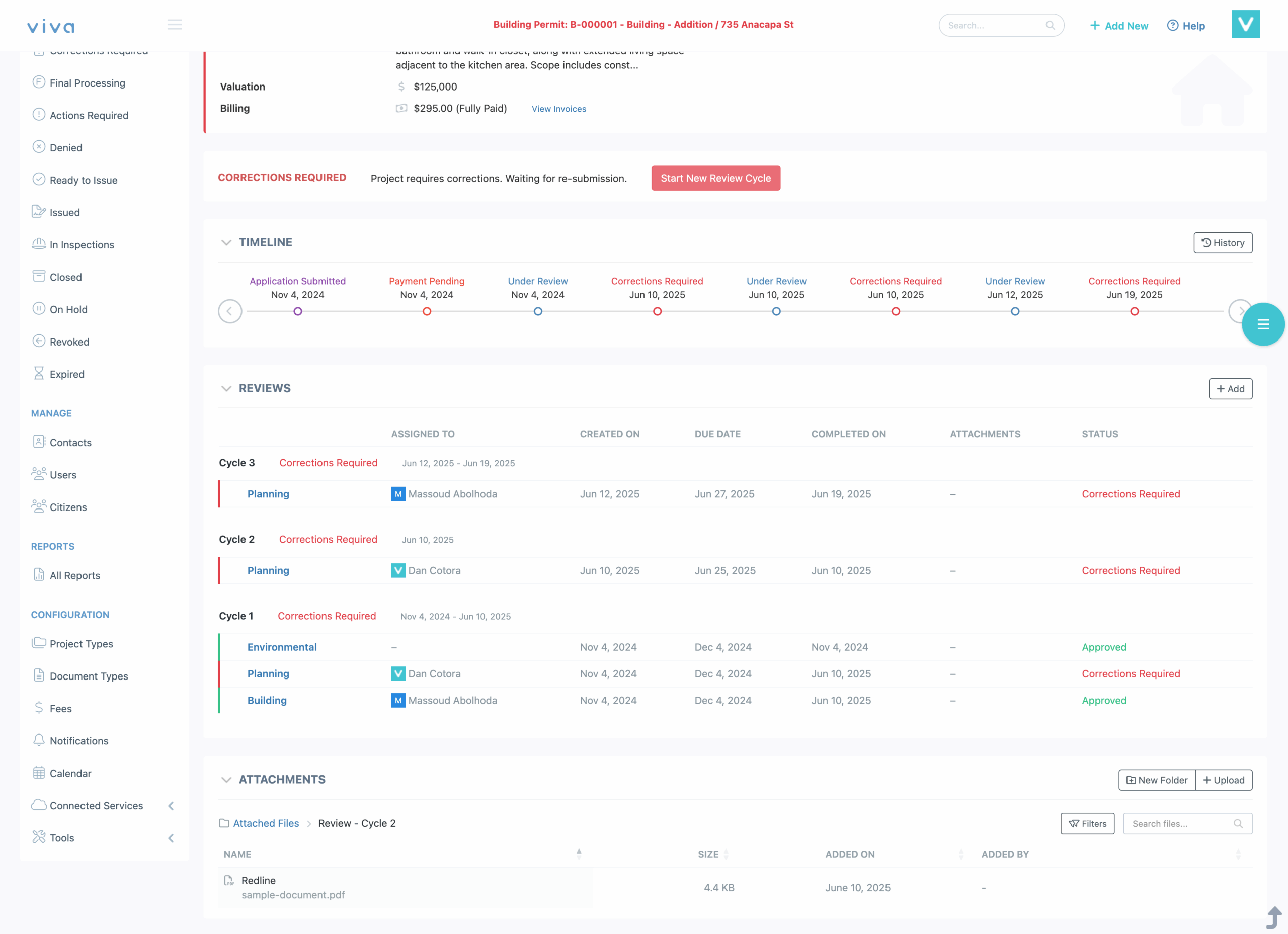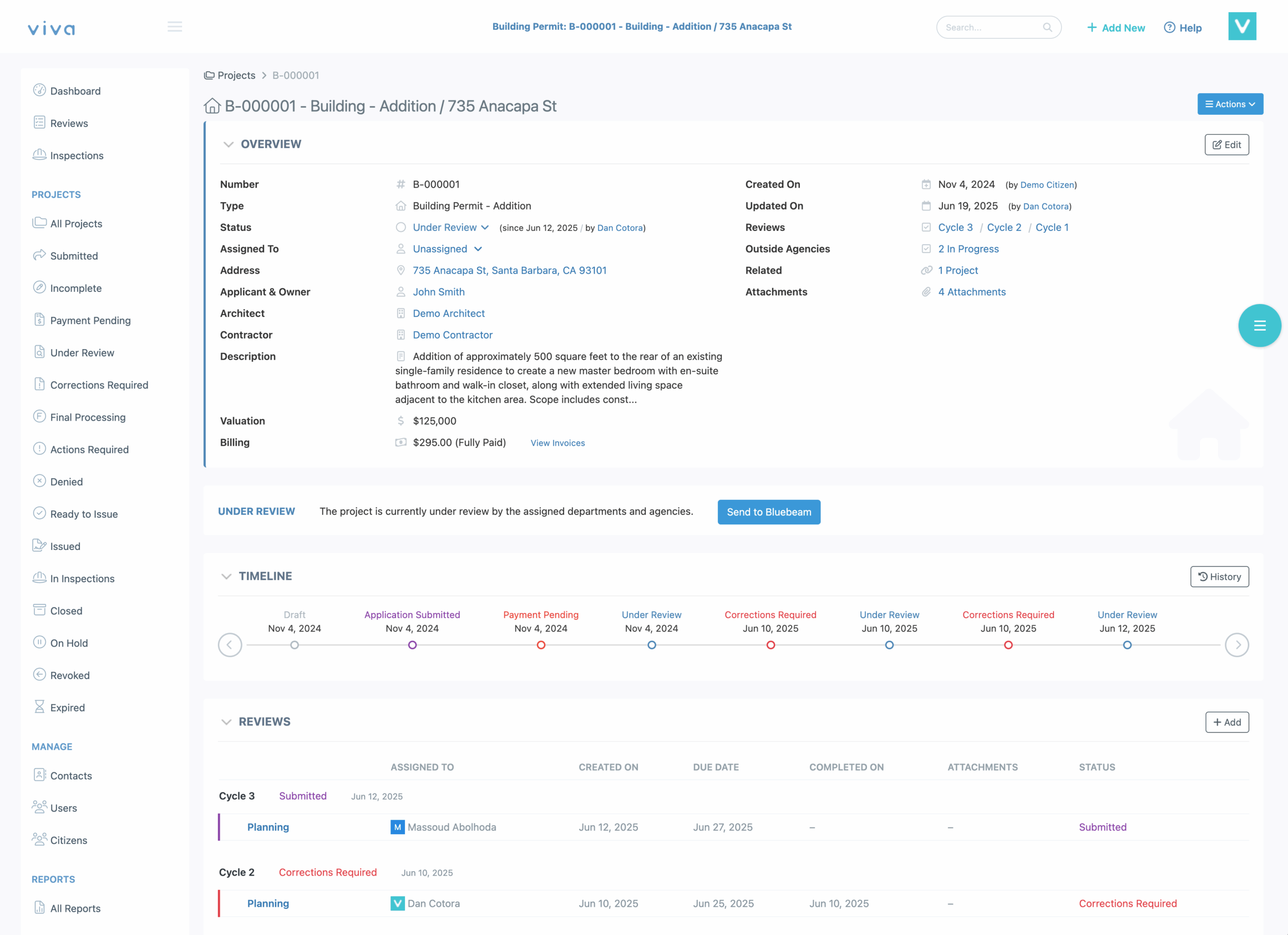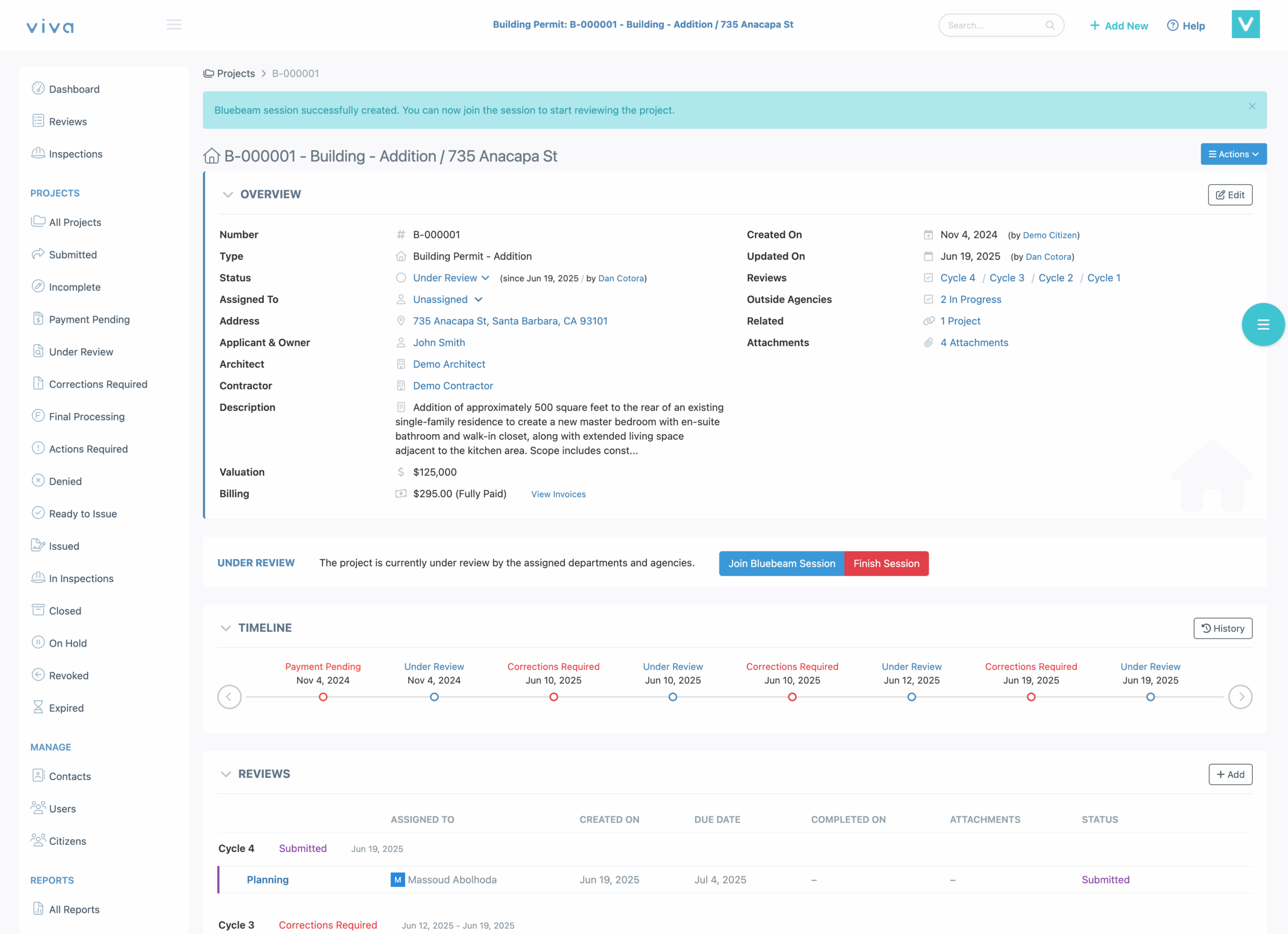 Med Viva Civic går det snabbt och enkelt att utföra plangranskningar helt digitalt genom en direkt integration med Bluebeam Studio. Du behöver inte längre ladda upp manuellt eller arbeta med osammanhängande arbetsflöden – du får tillgång till smidigt, automatiskt samarbete.Med Viva Civic kan ditt team starta Bluebeam-sessioner direkt från bygglovs- eller projektposten. Planerna dirigeras automatiskt till rätt granskare, och alla markeringar och kommentarer flödar tillbaka in i Viva Civic så att dina arbetsflöden rullar på och dina dokument hålls synkroniserade.
